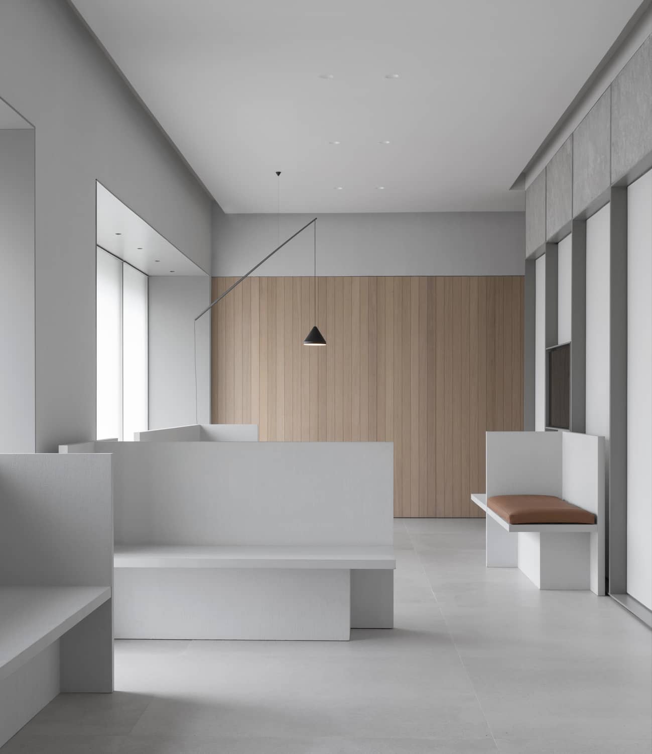 La distribución circular facilita el flujo entre recepción, áreas de espera y gabinetes, mientras que el uso de vidrio óptico matizado permite la creación de subespacios privados sin perder amplitud. Elementos retroiluminados y la abundante luz natural contribuyen a un ambiente tranquilo y acogedor para los pacientes.